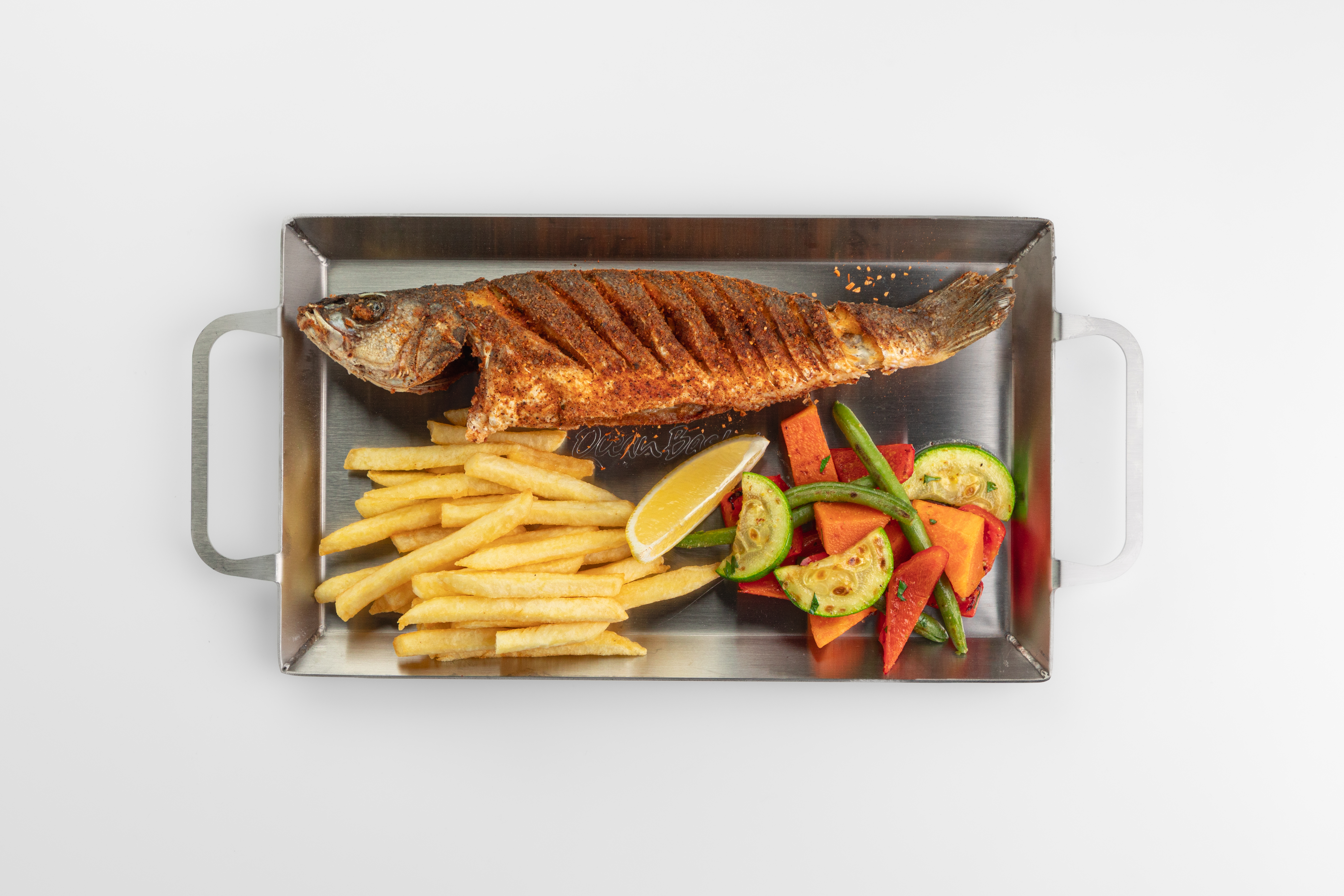 целая рыба обжаренная в панировке в ароматной смеси специй Дукка (восточная смесь специй на основе орехов, кориандра, кумина и кунжута)