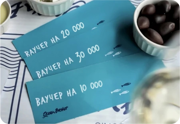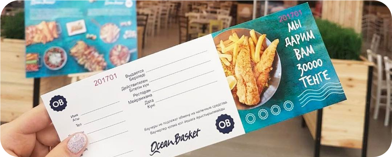 Приобрести подарочный сертификат можно в любом ресторане Ocean Basket Казахстан. Мы предлагаем подарочные сертификаты разного номинала: